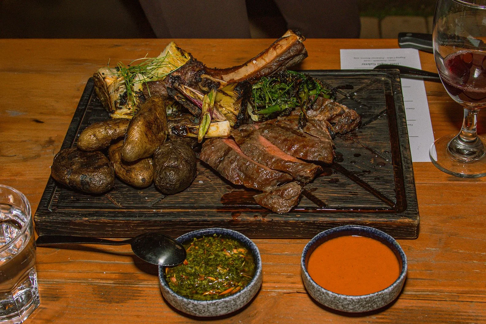 Smoked Ribeye steak — slow-cooked over oak and mesquite, sliced thick, and topped with chimichurri made from ranch-grown herbs. Accompanied by fire grilled carrots and roasted fingerling potatoes.